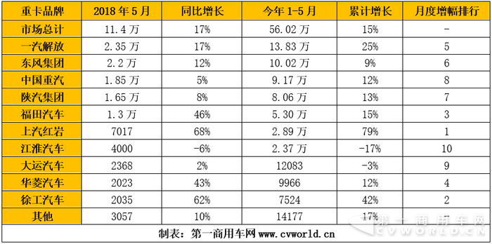2018年5月份,我國(guó)重卡市場(chǎng)共約銷售各類車型11.4萬輛,比去年同期的9.77萬輛增長(zhǎng)17%。這也是繼今年1月、3月和4月份重卡市場(chǎng)銷量創(chuàng)造月度新高之后,重卡市場(chǎng)第四次打破月銷量紀(jì)錄。在今年5月之前,歷史最高點(diǎn)出現(xiàn)在2010年5月,當(dāng)年的5月份銷量是10.7萬輛。