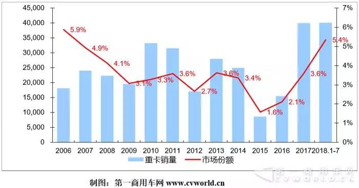 在今年前七個月累計銷量排名前十的重卡企業(yè)中,增長最快的仍然是上汽紅巖,其同比增幅達(dá)到71%。這家企業(yè)2017年銷量同比增長158%;2018年以來月銷量一直保持高速增長:1月份同比增長194%,2月份增長50%,3月份增長66%,4月份和5月份均同比增長68%,6月份同比增長60%,7月份同比增長42%。從下圖也可以看出,這家老牌企業(yè)近年來的市場份額一路攀升,2018年1-7月占有率達(dá)到5.4%,穩(wěn)步朝著它確立的“666”年度目標(biāo)邁進(jìn)。